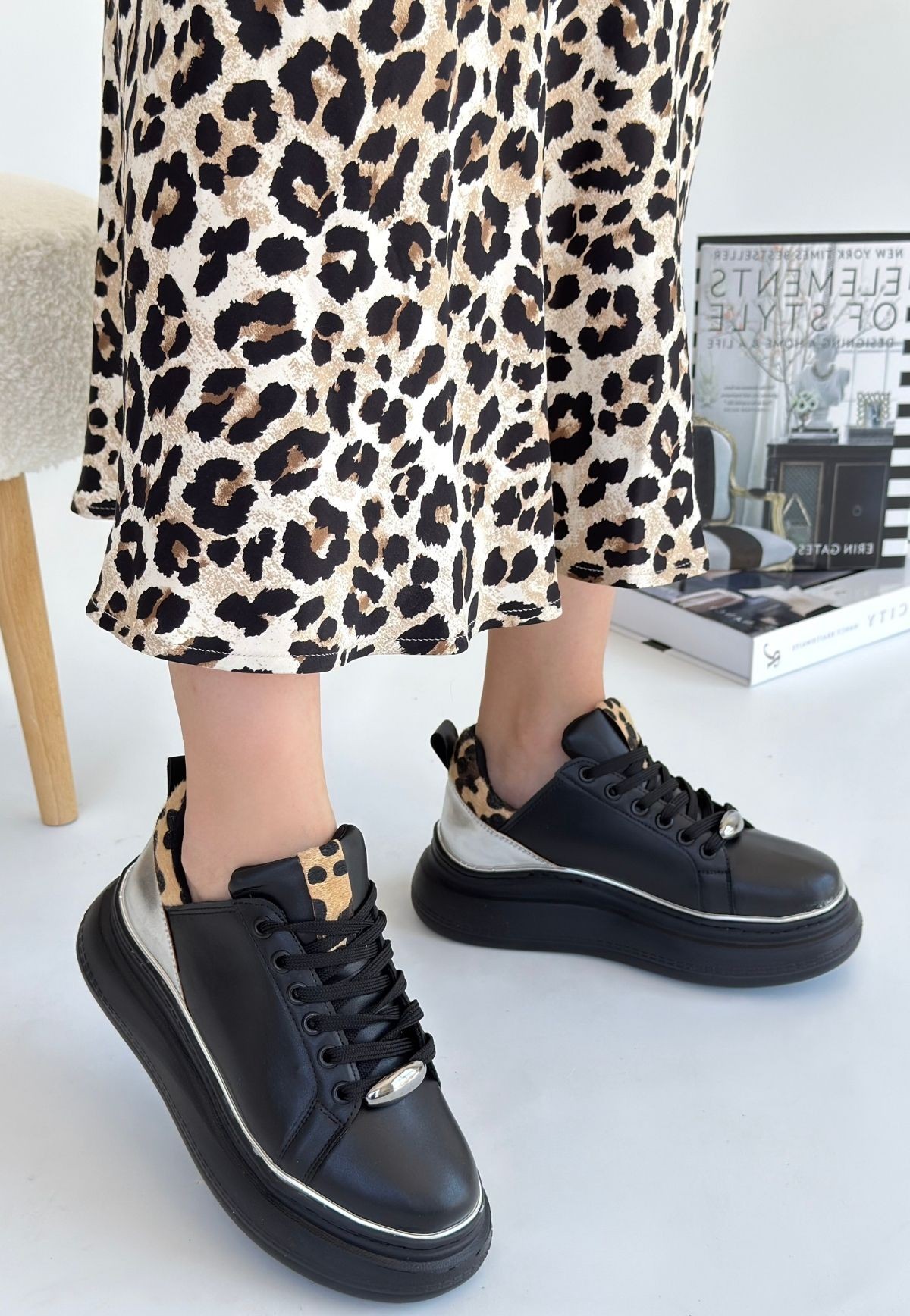 Jista Siyah Cilt Gümüş Detaylı Bağcıklı Spor Ayakkabı