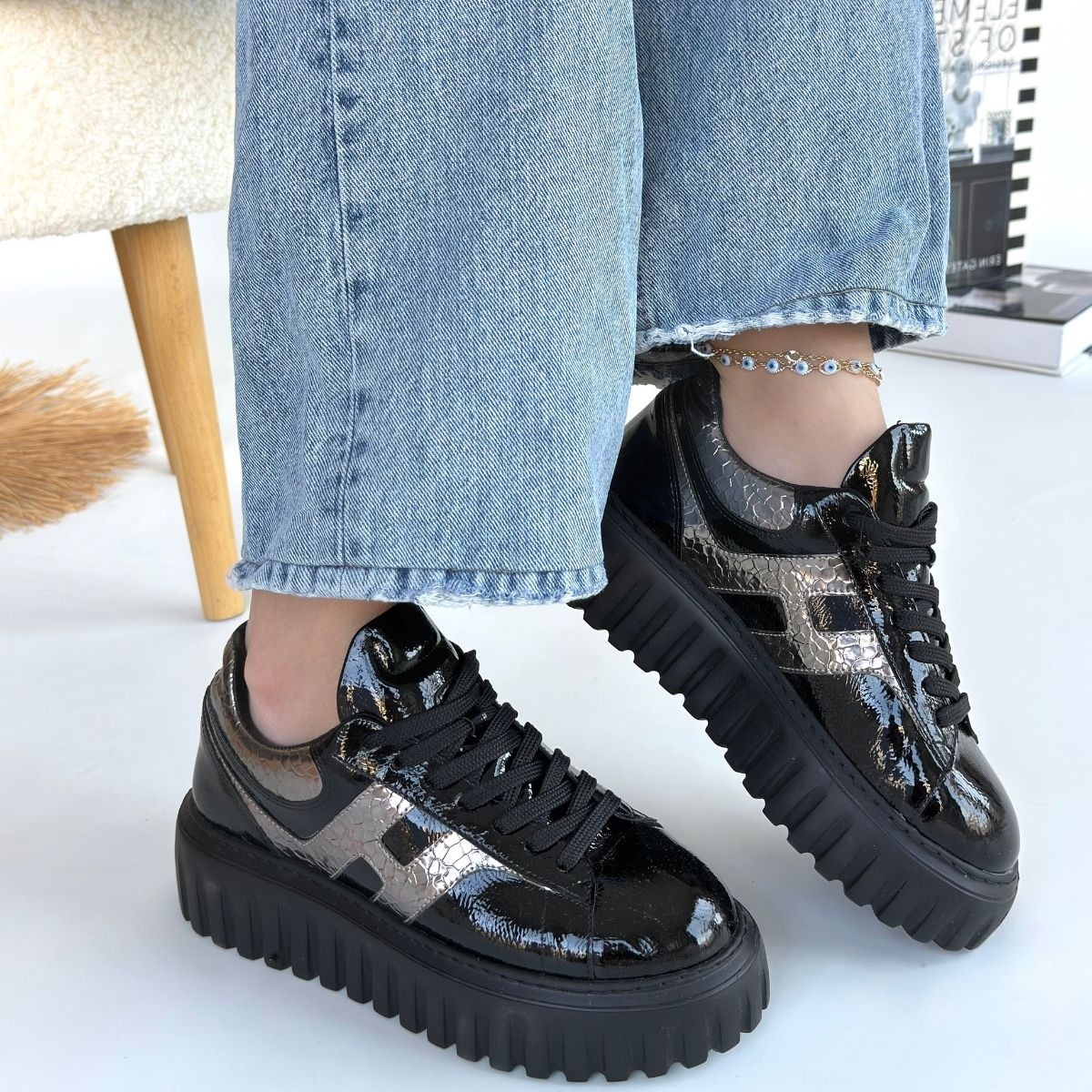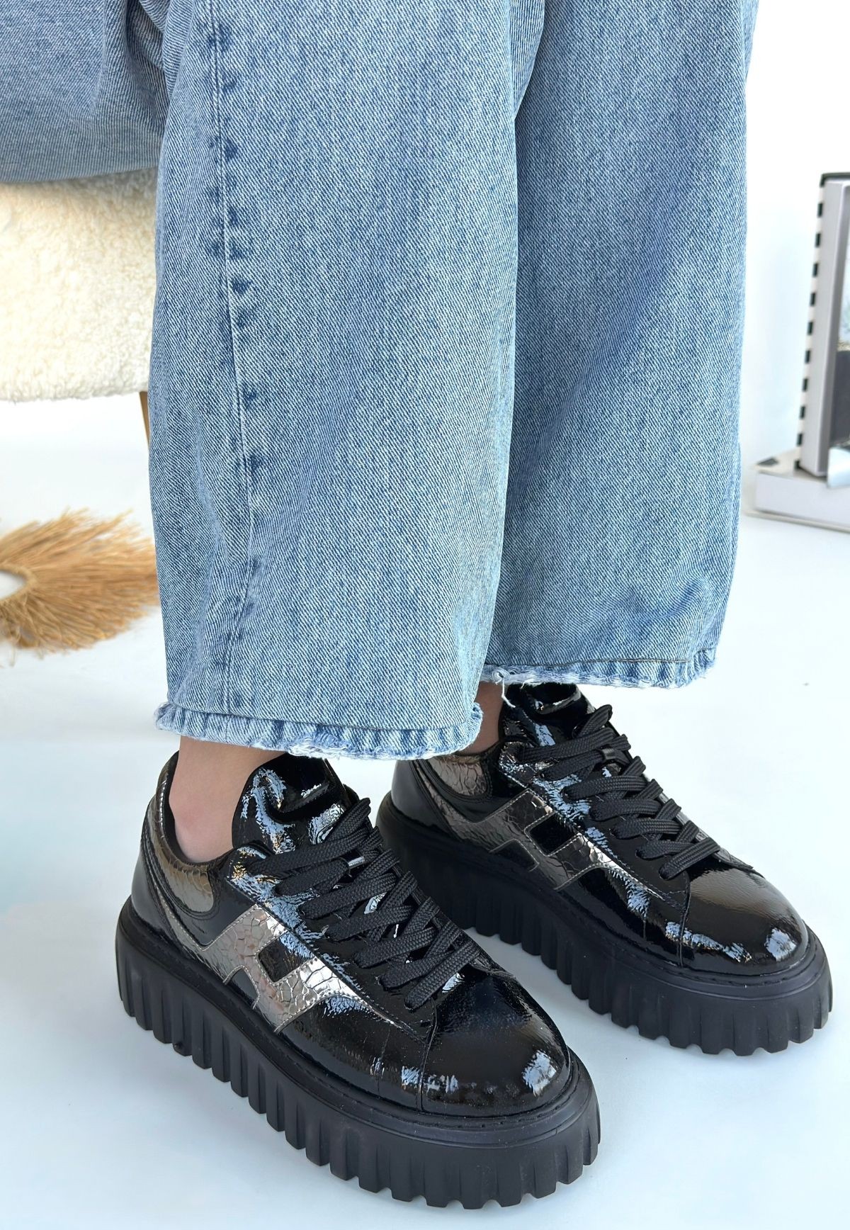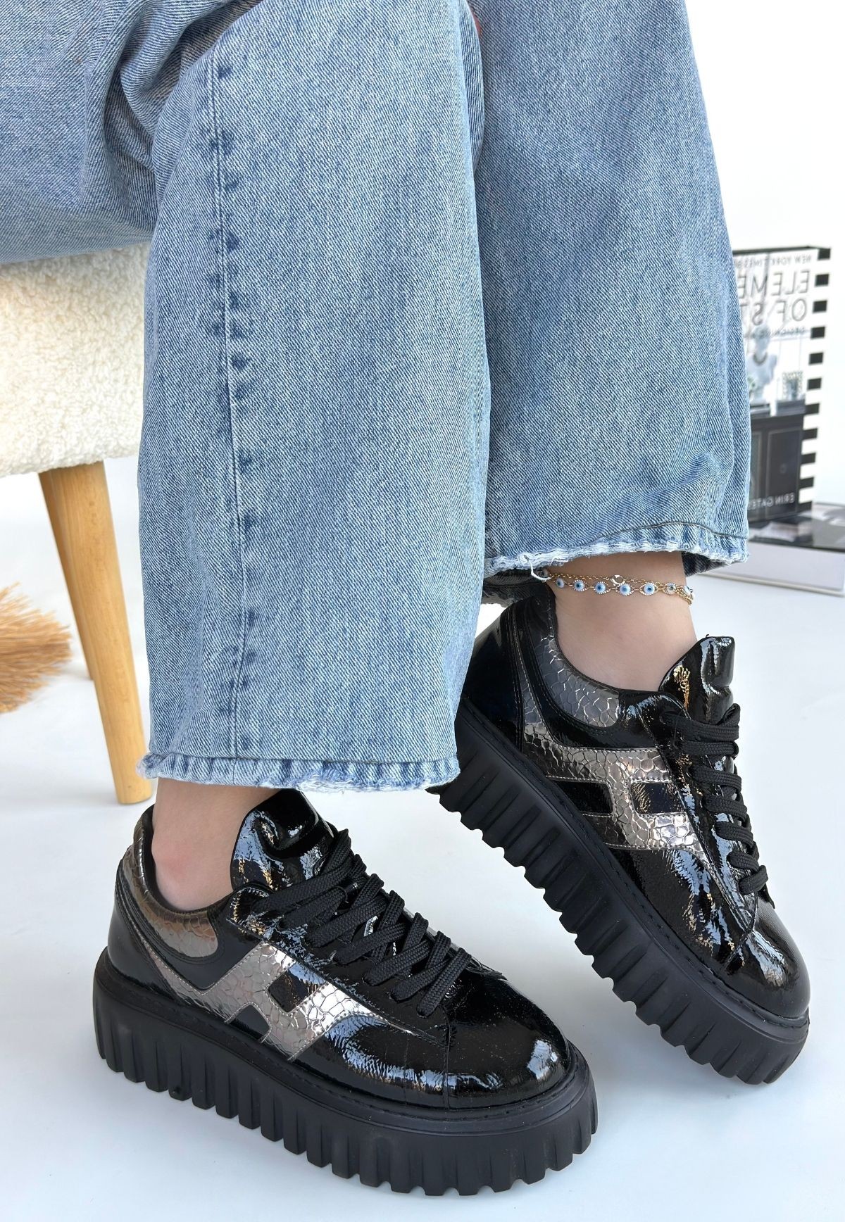 Gesti Siyah Rugan Platin Detaylı Bağcıklı Spor Ayakkabı