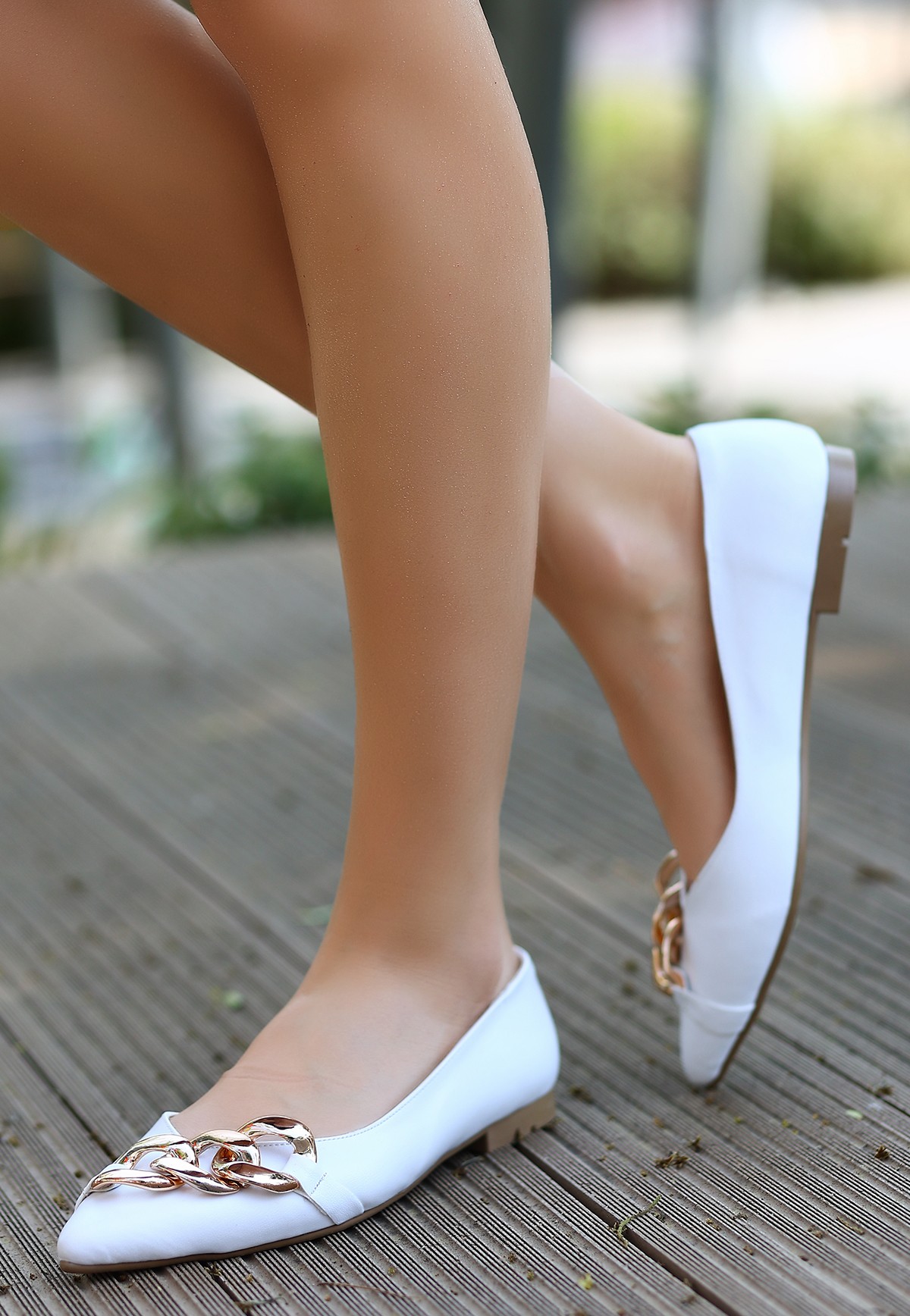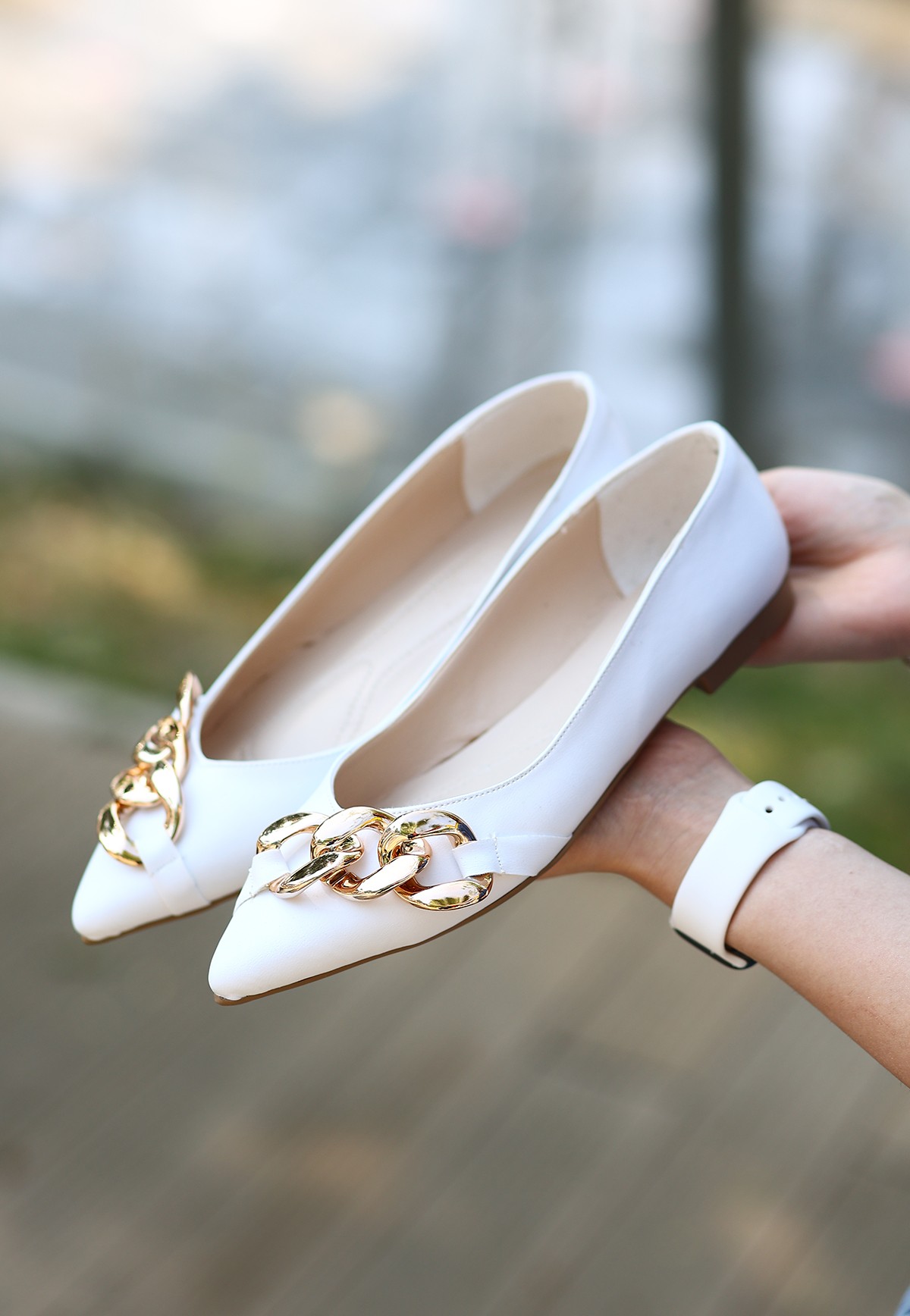 Babet Ayakkabı Popi Beyaz Cilt Zincirli Babet Ayakkabı