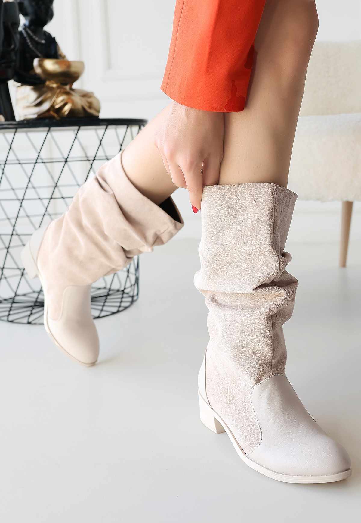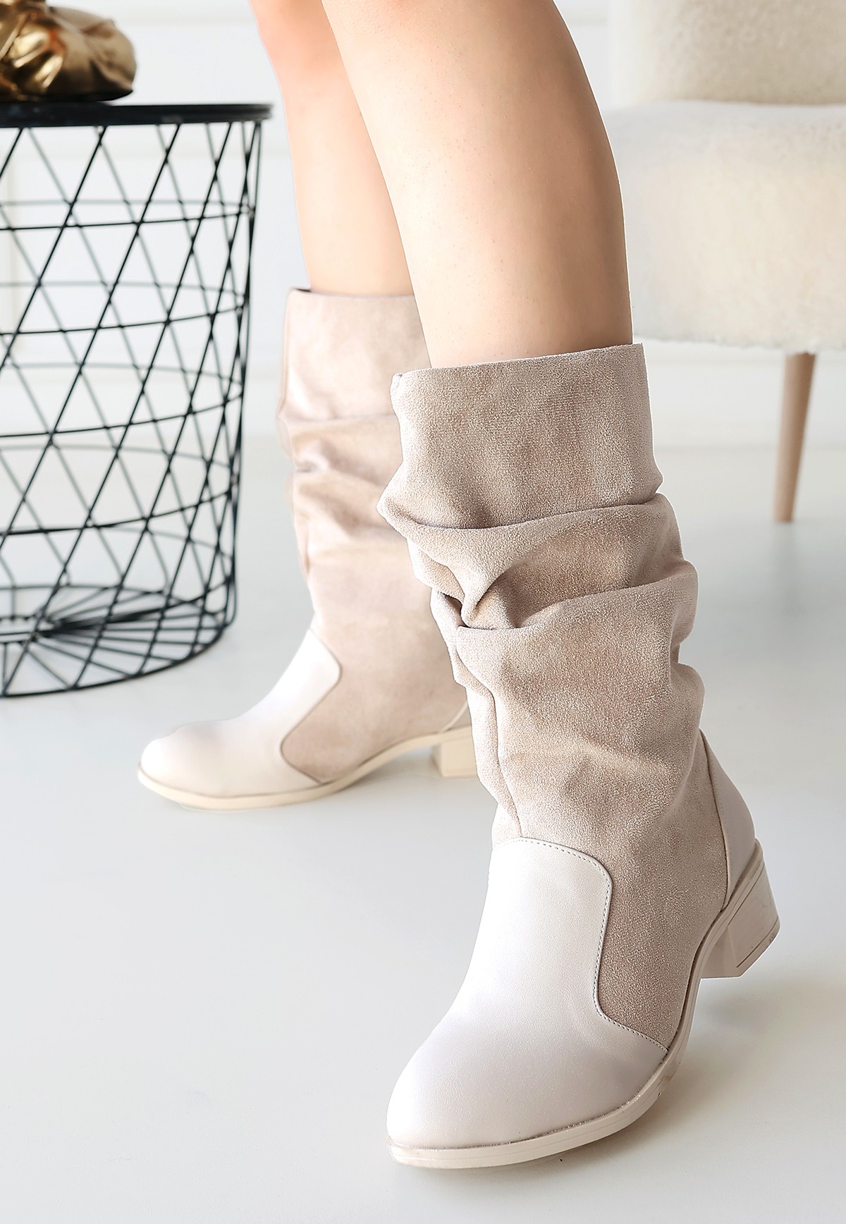 Çizme Jolin Bej Cilt Süet Detaylı Çizme
