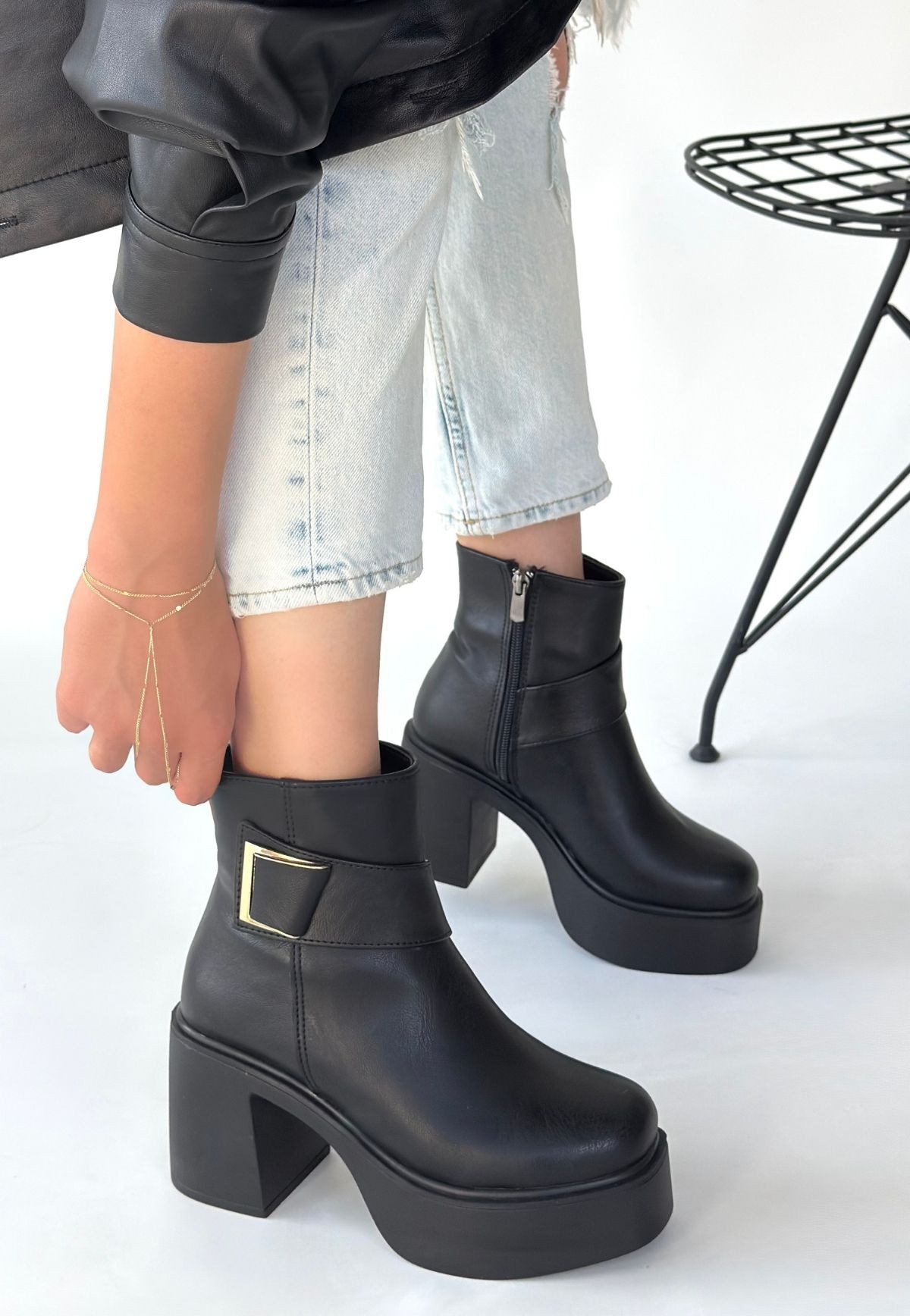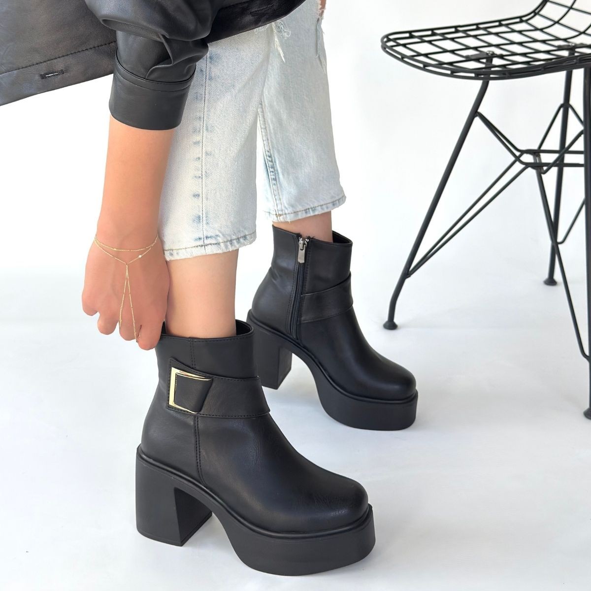 Kadın Bot Lonji Siyah Cilt Topuklu Bot