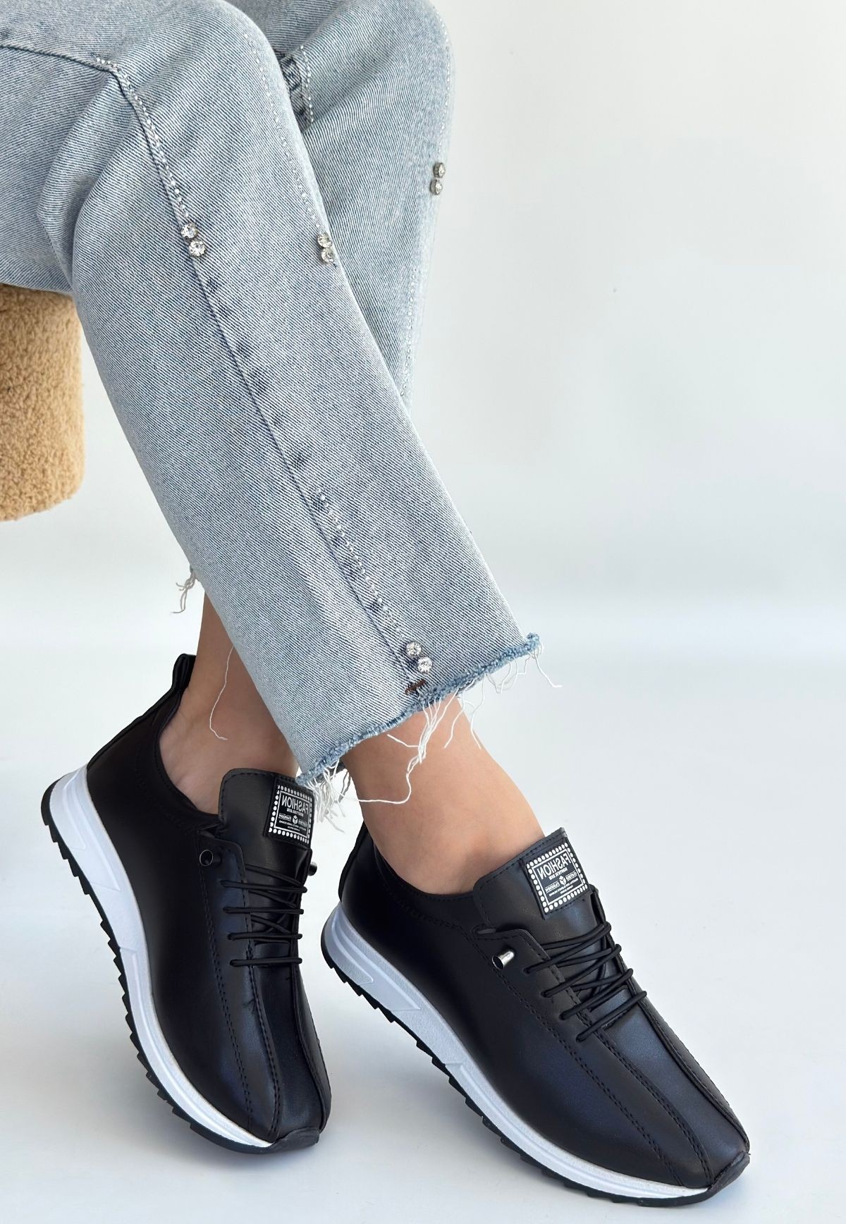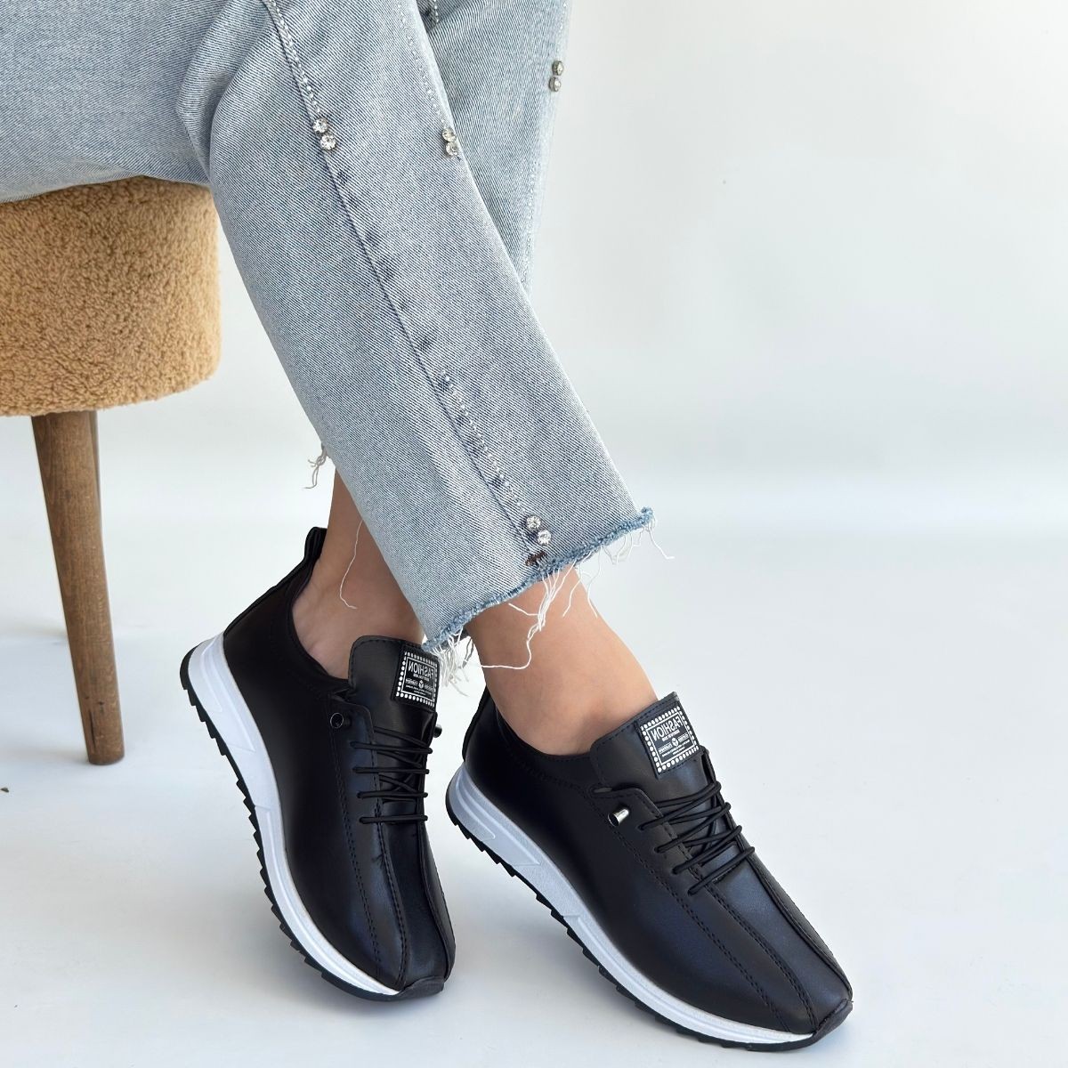 Monya Siyah Cilt Bağcıklı Spor Ayakkabı