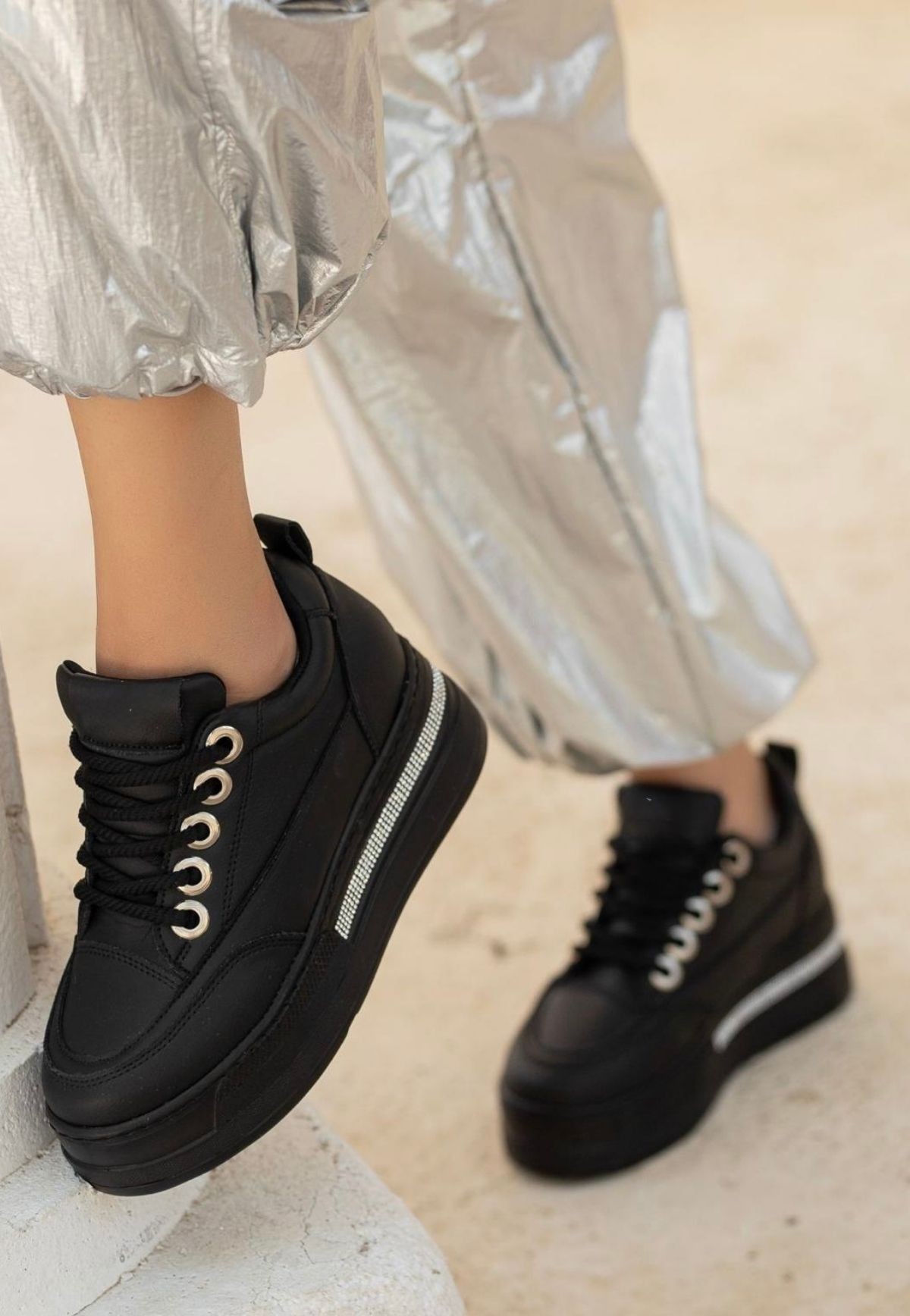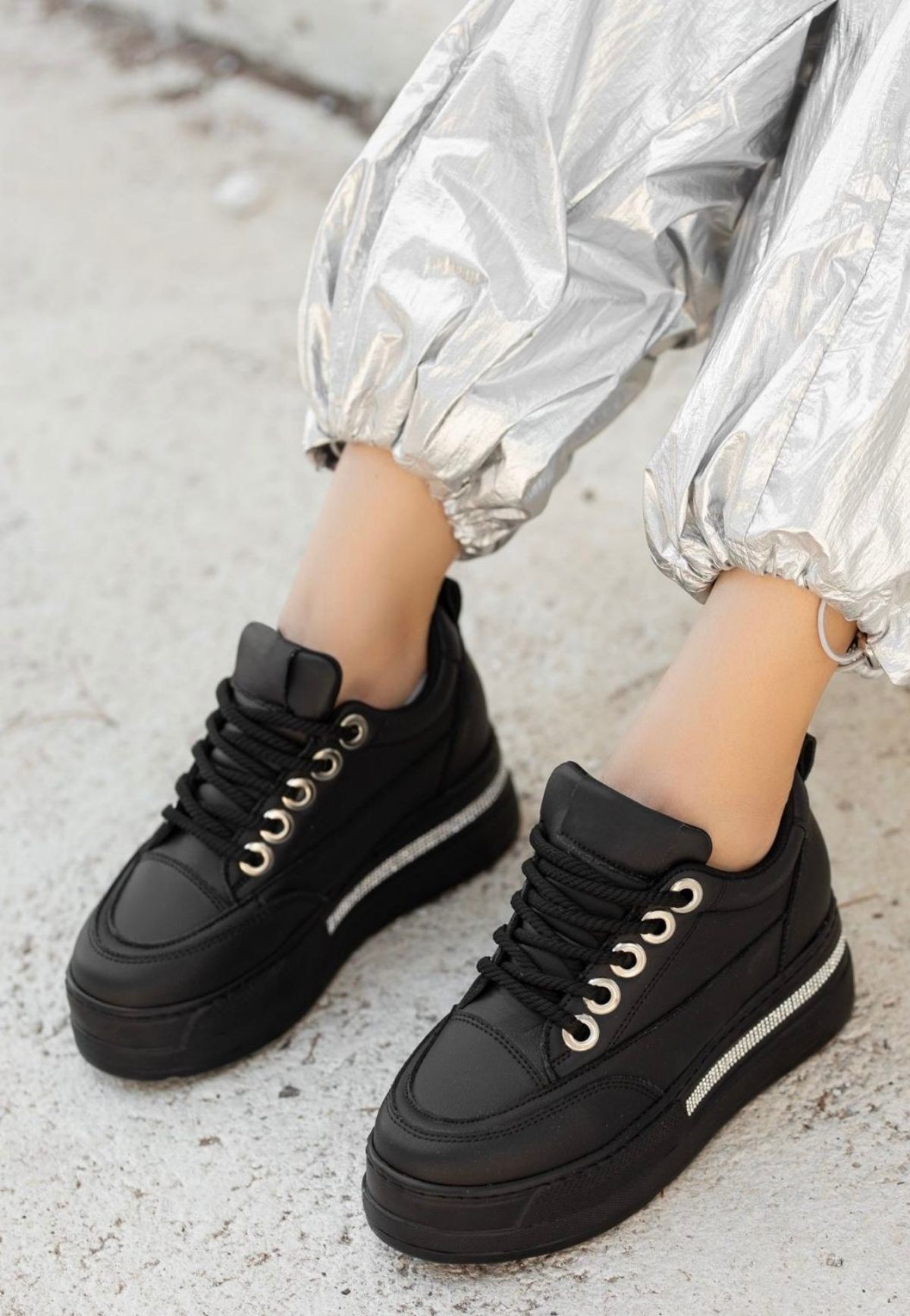 Kadın Spor Lulu Siyah Cilt Bağcıklı Spor Ayakkabı