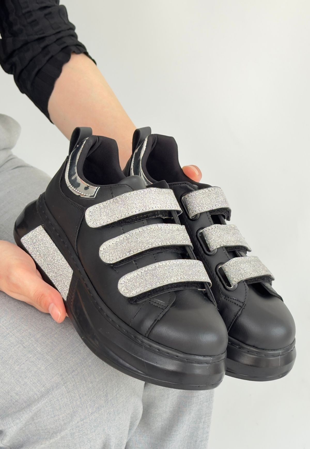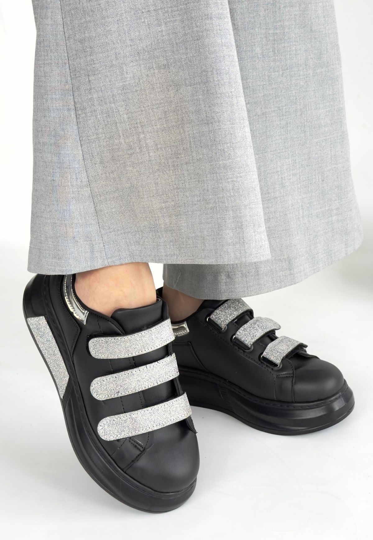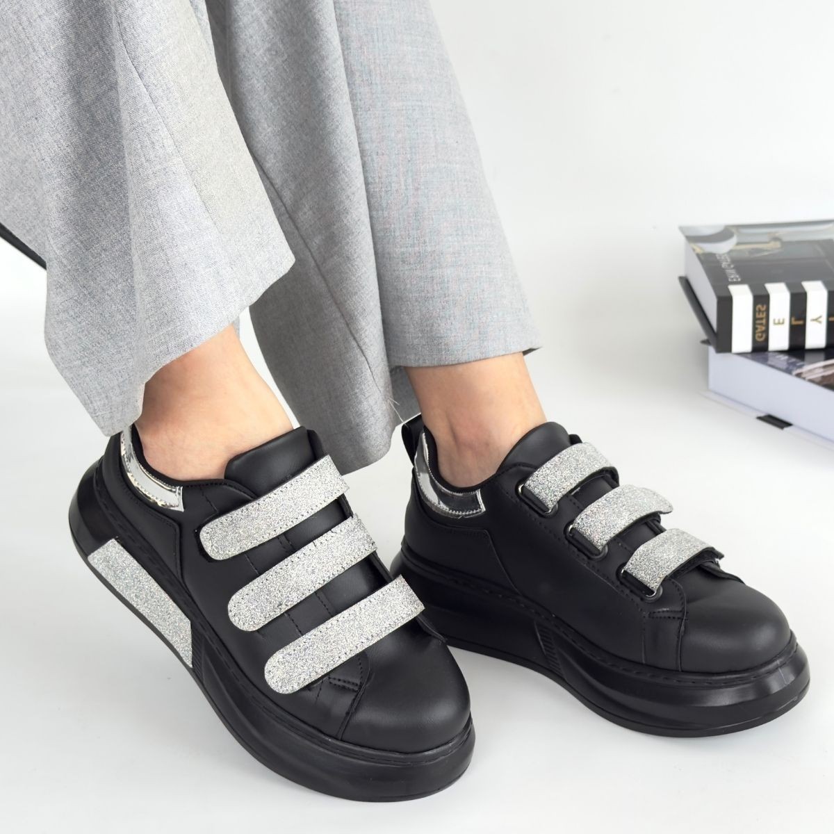 Kadın Spor Elika Siyah Cilt Simli Cırt Cırtlı Spor Ayakkabı