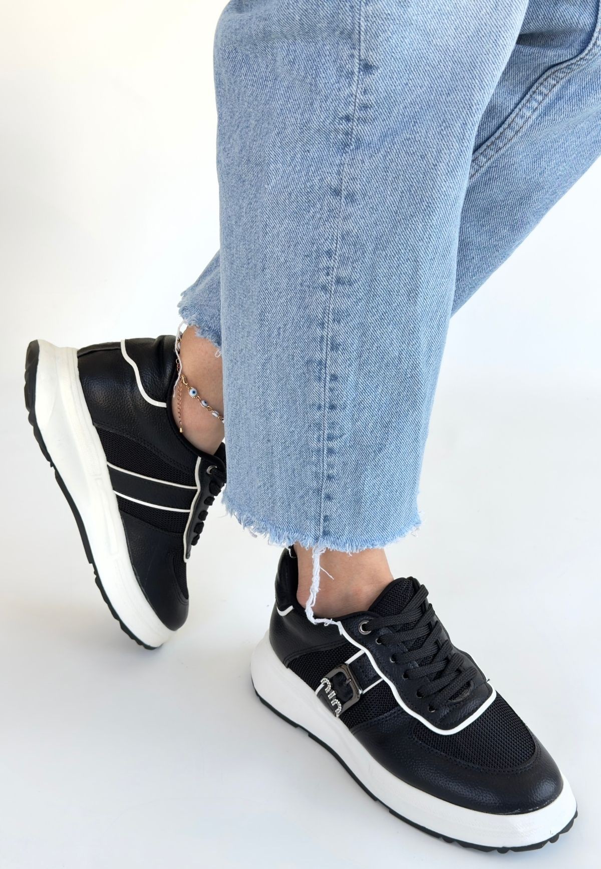 Kadın Spor Tanwe Siyah Cilt Bağcıklı Spor Ayakkabı